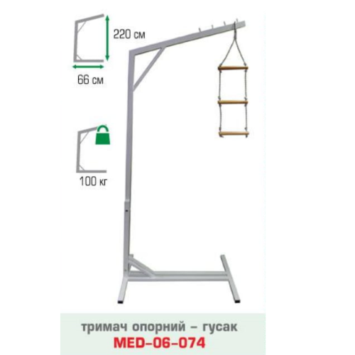Якщо людині через захворювання опорно-рухового апарату важко самостійно підніматися з ліжка, необхідно оснастити ліжко медичним спеціальним власником Medok-06-074. Трирівневі мотузкові сходи ( сходи в комплект не входять ) кріпляться до трапеції підлоги. Користувач, вхопившись рукою за перше перетинання, може поступово приймати вертикальне положення, підтягуючись за опору. При деяких травмах або післяопераційному періоді пацієнтам рекомендується використовувати приліжковий гусак для відновлення тонусу м'язів спини і рук.