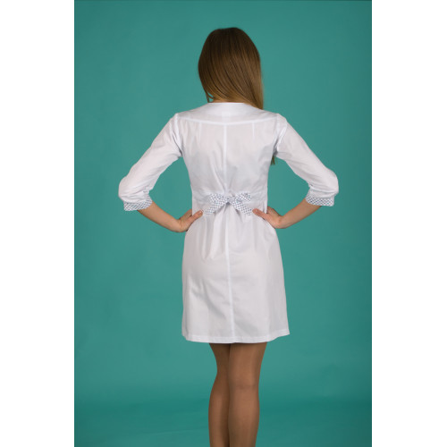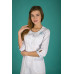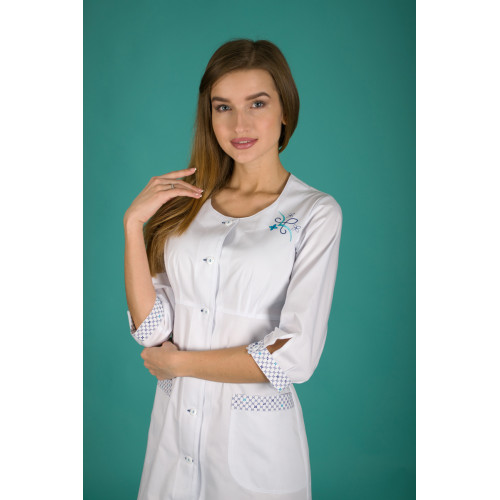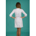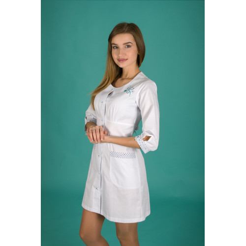 Халат виконаний в романтичному стилі. Має трапецієподібний силует, зручні накладні кишені, рукави із зустрічними складами та вишивкою, яка гармонійно по колориту поєднується з кантом по горлу. Халат створено в останніх тенденціях моди. Халат короткий трохи донизу розкльошений, з вишивкою.