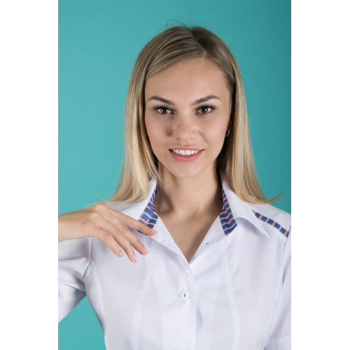 Модель джинсового стилю. занижена талія, кишені із підрізним бочком, сорочковий комір. Верхня частина халату із рельєфними швами. Рукавка з манжетом. Халат може бути чисто-білим та з контрастною обробкою. Даний виріб чудово поєднується з брюками, так як модель укороченої довжини (близько 88-90 см по середині спинки).