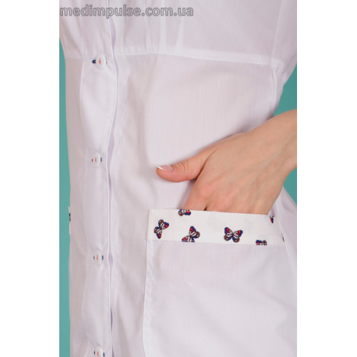 Популярна модель у новому виконанні. Для літнього сезону пропонується з коротким рукавом на манжеті. Як обробка використана сорочкова тканина в принт з метеликом і вишивка, що повторює малюнок.