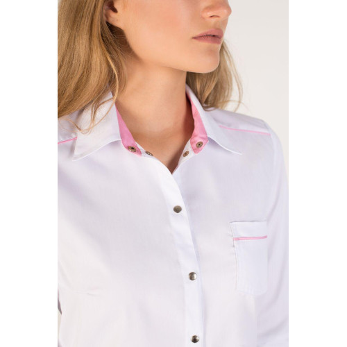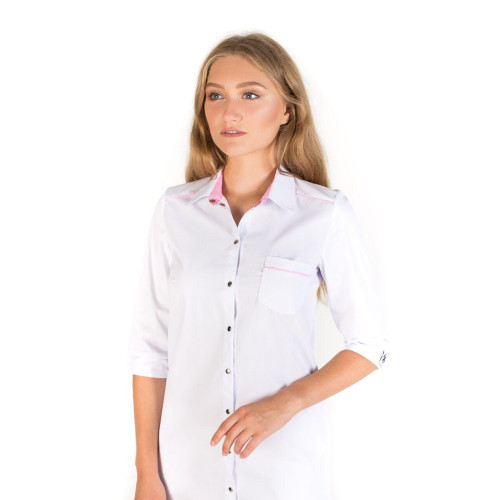 Білий медичний халат зі строчкою в рожевому кольорі.