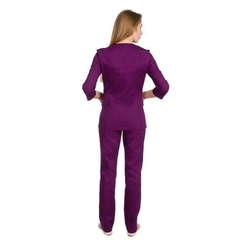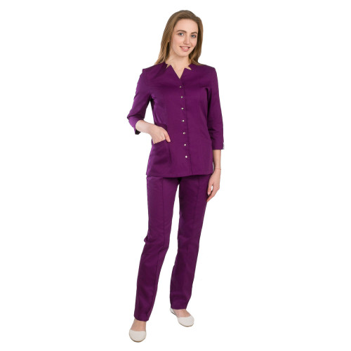 Медичний жіночий костюм на кнопках. Тканина: 35% - бавовна, 65% - поліестер. Має 2 кишені на куртці. Четвертий рукавчик. Розміри: 40-54.