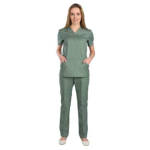 Костюм пошитий з урахуванням усіх вимог до медичного одягу: зручна посадка, функціональні кишені спереду, короткий рукав. Склад тканини: 35% бавовна, 65% поліестер. Розмірний ряд із 40 по 48.