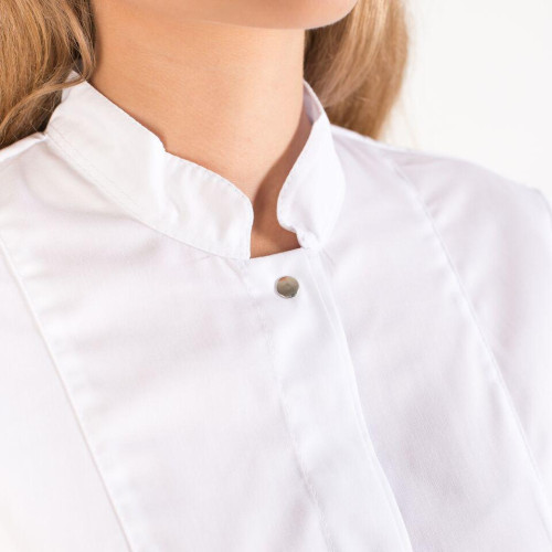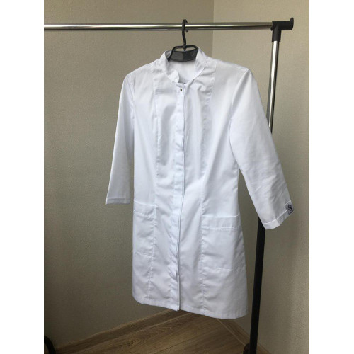 Халат виконаний на кнопочках, забезпечений 2 кишенями та четверним рукавом