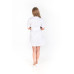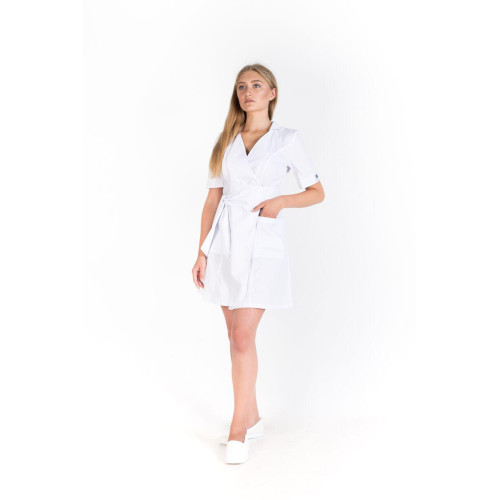 Халат виконаний на запах, застібається на потайні кнопочки. Забезпечений красивим широким поясом, 2 накладними кишенями та коротким рукавчиком.