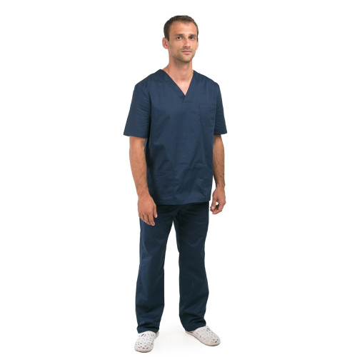 Склад: 65% поліестер, 35% бавовна. Щільність тканини 165г/м2. Костюм хірургічного типу. Рукав короткий. Має дві передні кишені. Колір синій. Розмірний ряд із 44 по 56.